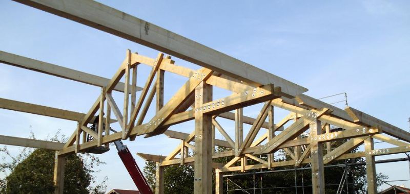 Die landwirtschaftliche Halle wurde in vier Feldern, davon eins in Massivbau die anderen mit Holzbindern mit auskragenden Vordach, erstellt. Das Bild zeigt die Tragkonstruktion des Holzbinders.
